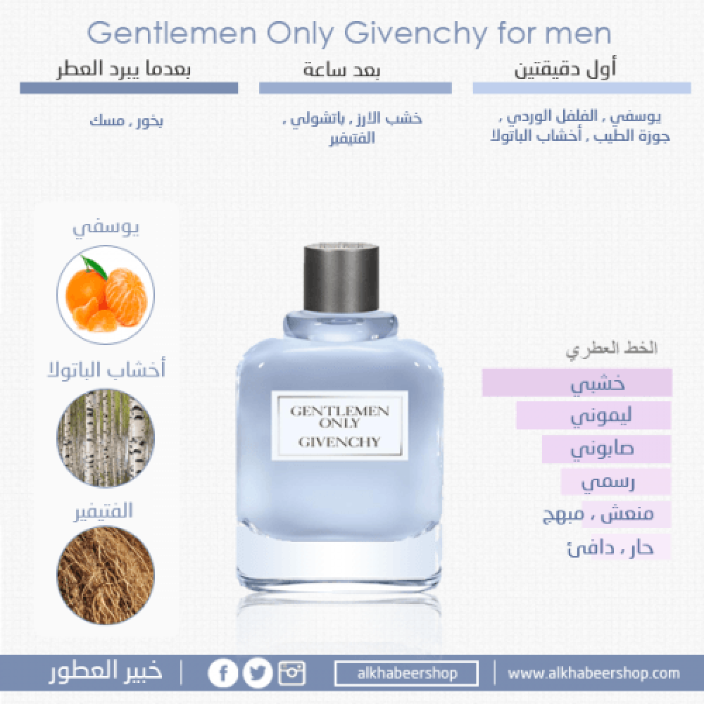 الخط العطري: وودي جنتلمان اونلي (Gentlemen Only). من اصدارات بيت الأزياء العالمي جيفنشي (Givenchy). العطر من العائلة الخشبية صمم للرجال. وهو من اصدارات عام 2013. عطر خشبي حار للرجال. طازج ونظيف وعميق ويرفع المعنويات. مكوناته العليا من اليوسفي الأخضر والفلفل الوردي وجوزة الطيب وأوراق البتولا. مكونات القلب من الأرز والباتشولي ونجيل الهند. مكونات القاعدة من البخور. مثالي لجميع المناسبات. Givenchy Gentlemen Only Eau de Toilette 100ml باركود Barcode المنتج 3274870012136