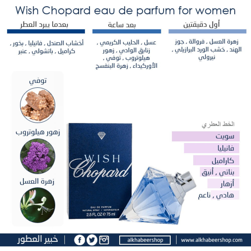 الخط العطري: اورينتال فانيليا عطر شرقي - فانيليا للنساء . Wish صدر عام 1997. Nathalie Lorson قام بتوقيع هذا العطر. إفتتاحية العطر جوز الهند, الفراوله, عنب الثعلب , أشجار الجراد أسود, الكمثري, الكشمش الأسود, خشب الورد البرازيلي, زهر العسل - صريمة الجدي, يوزو و زهر البرتقال . قلب العطر العسل, اللبن, الأوركيد, الهيلوتروب, البنفسج, أوسمانثوس , الماغنوليا, الياسمين و زنابق الوادي . قاعدة العطر تتكون من الكاراميل, الفانيليا, الباتشولي, الطوفي, البخور, خشب الصندل, العنبر و حبوب التونكا. Chopard Wish Eau de Parfum 75ml باركود Barcode المنتج 764017736619